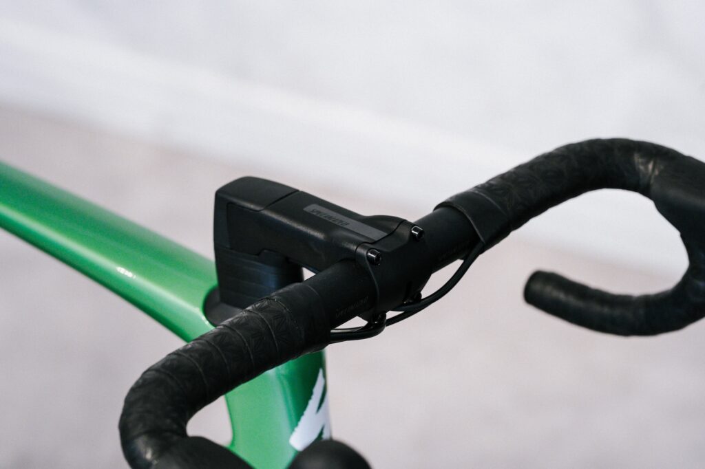 コックピット(ハンドルまわり)には、SpecializedのShallow Dropハンドルを採用。ドロップは125mm、リーチは70mmと浅めの設計で、ブラケットポジションからドロップポジションへの移行がスムーズ。長時間のライドでも無理のないポジションを取りやすく、扱いやすさと操作性を両立しています。
