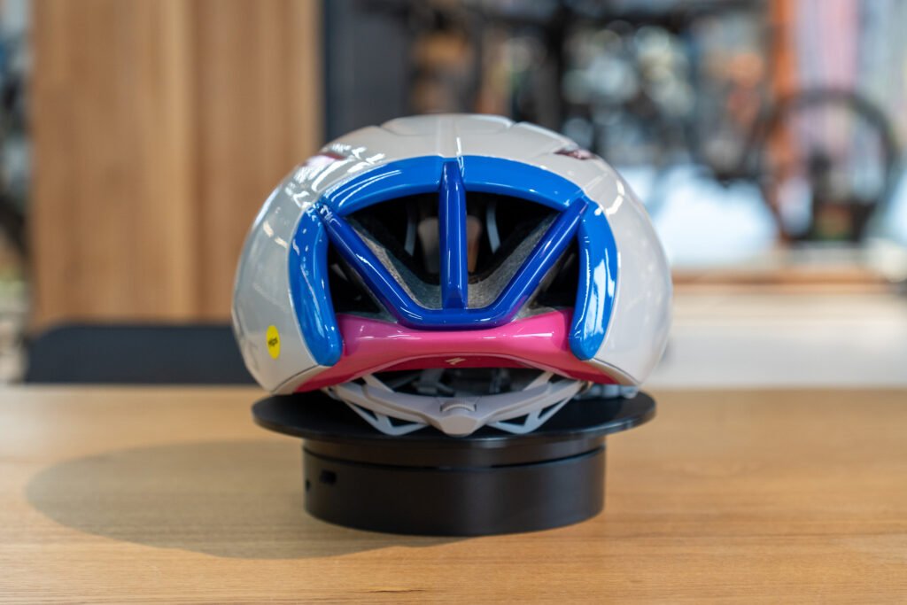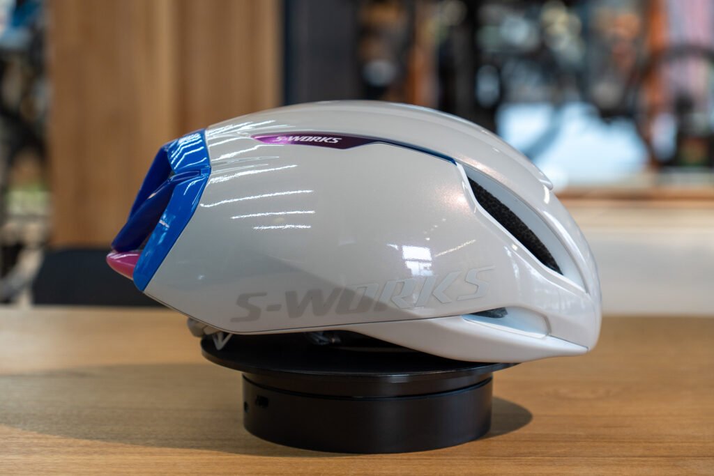 まずは、ドロマイトマルチからご紹介します。光が当たった時にその美しさが目立つパールホワイトをベースに、サイドのS-Worksロゴ部分は、オイルスリックなカラーを採用。
