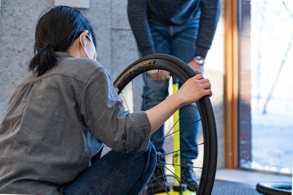 ・チャレンジ内容: 自転車から外したホイール単体の状態からスタート。チューブの空気を抜き、外して新しいチューブをセットし指定空気圧まで空気を入れるまでの時間を計測します。