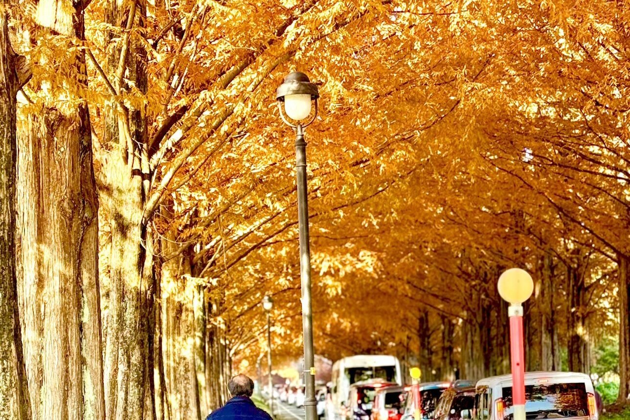 メタセコイヤ並木道へついに到着!紅葉シーズンということもあり車が渋滞💦