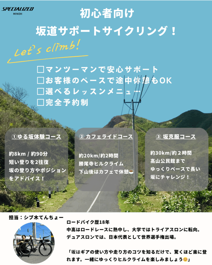 箕面浄水場~風の杜(登り2km)を2往復し、登りのコツやポジションなどアドバイスいたします。