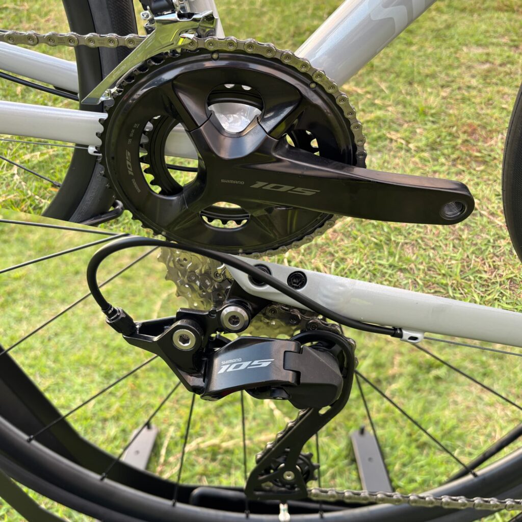 レーススペックの走りもできるように、コンポーネントにはShimano 105(12速・機械式)を搭載。
