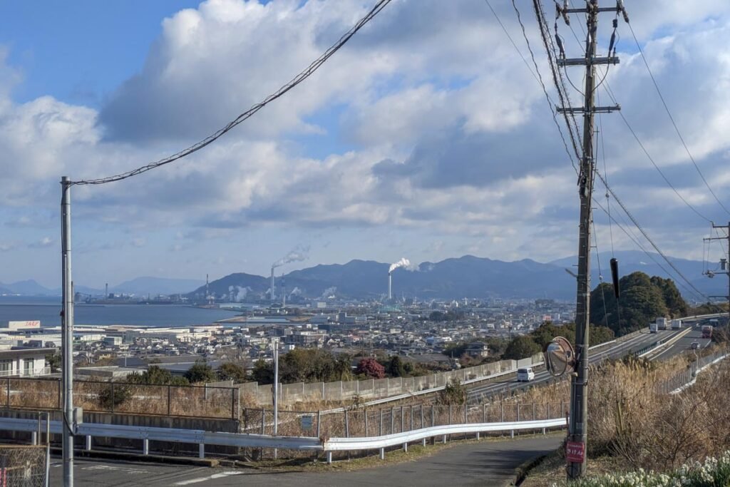 スタート地点の反対側の景色です。製紙会社の煙突がなんとも四国中央市らしいです。