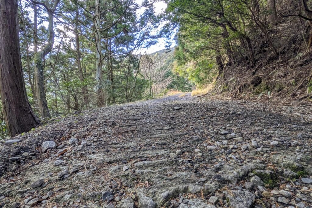 「林道 観音谷線」は全体的に下り基調です。路面は比較的締まった砂利道が中心ですが、場所によっては大きな岩や荒れた区間もあるため、走行には注意が必要です。