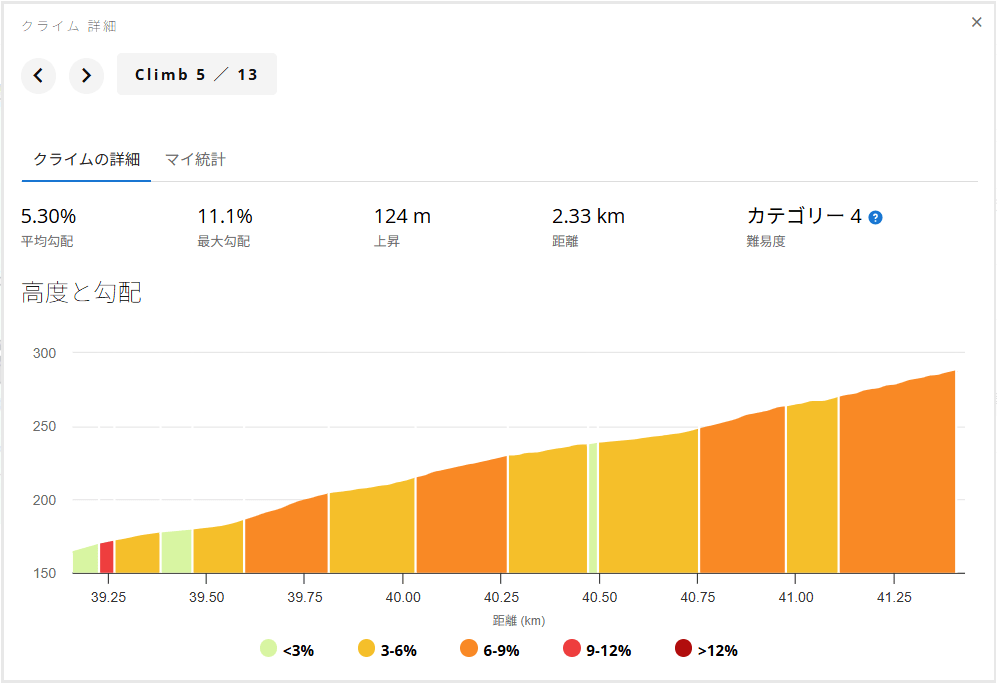 ここでは3~6%、6~9%の坂が連続するため、個人的にはかなりきつい印象がありました。