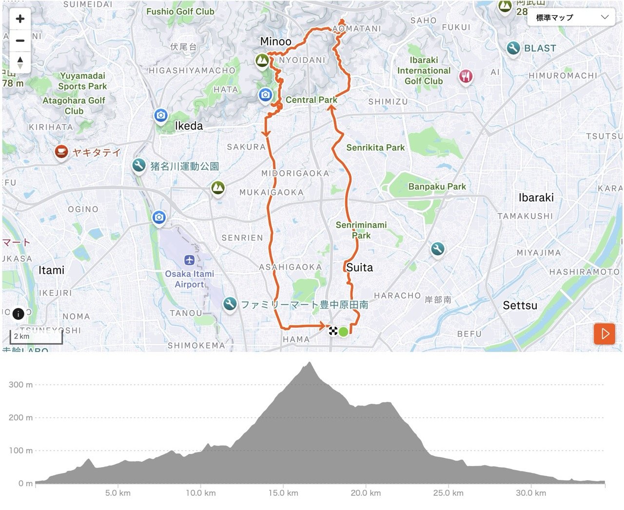 今回のルートは、スペシャライズド江坂から勝尾寺までの往復約 35 km