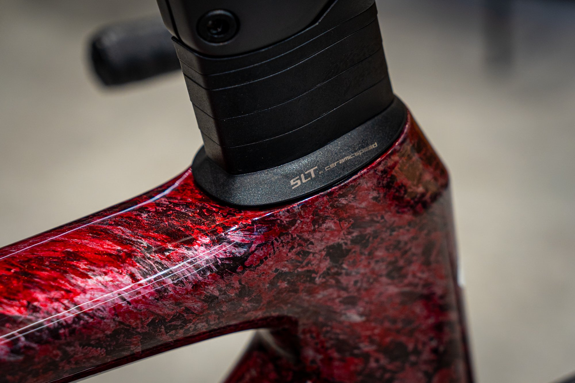 最近 S-Works のヘッドベアリングカバーにプリントされている ”SLT ceramicspeed” の文字