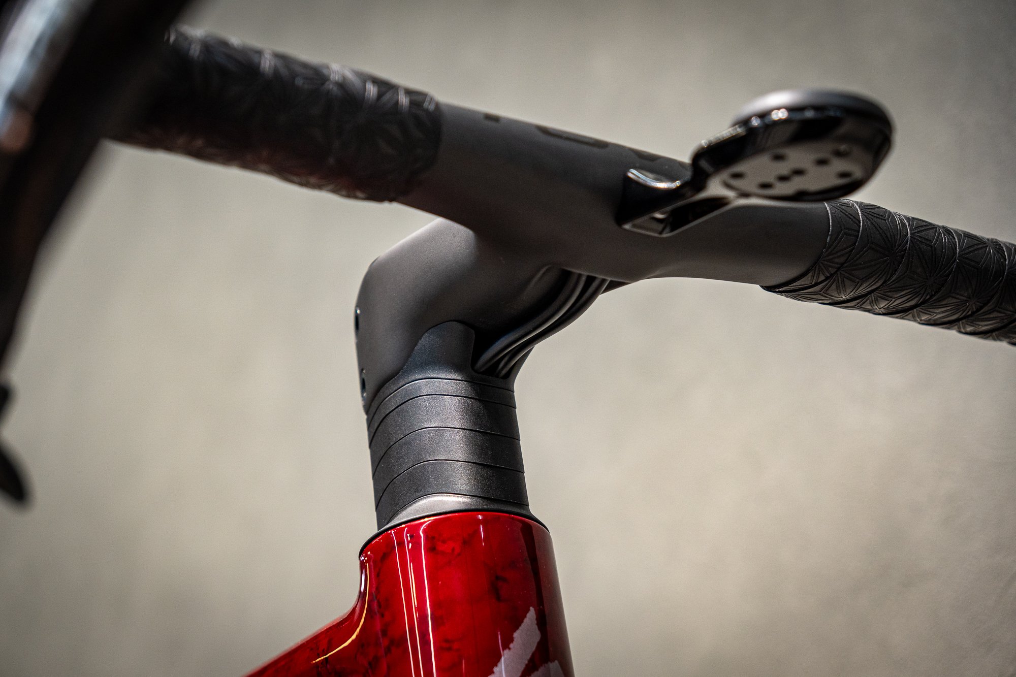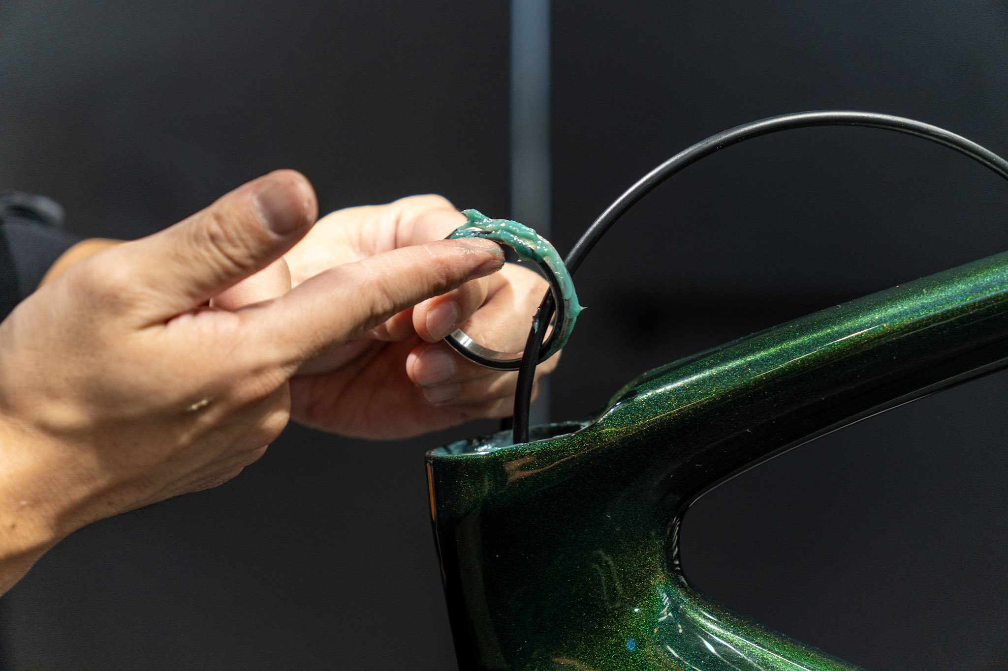 近年増えているケーブルがヘッドの内部に隠れている構造のフレームの多くは、ヘッドベアリングの内側をブレーキホースが貫通しています。