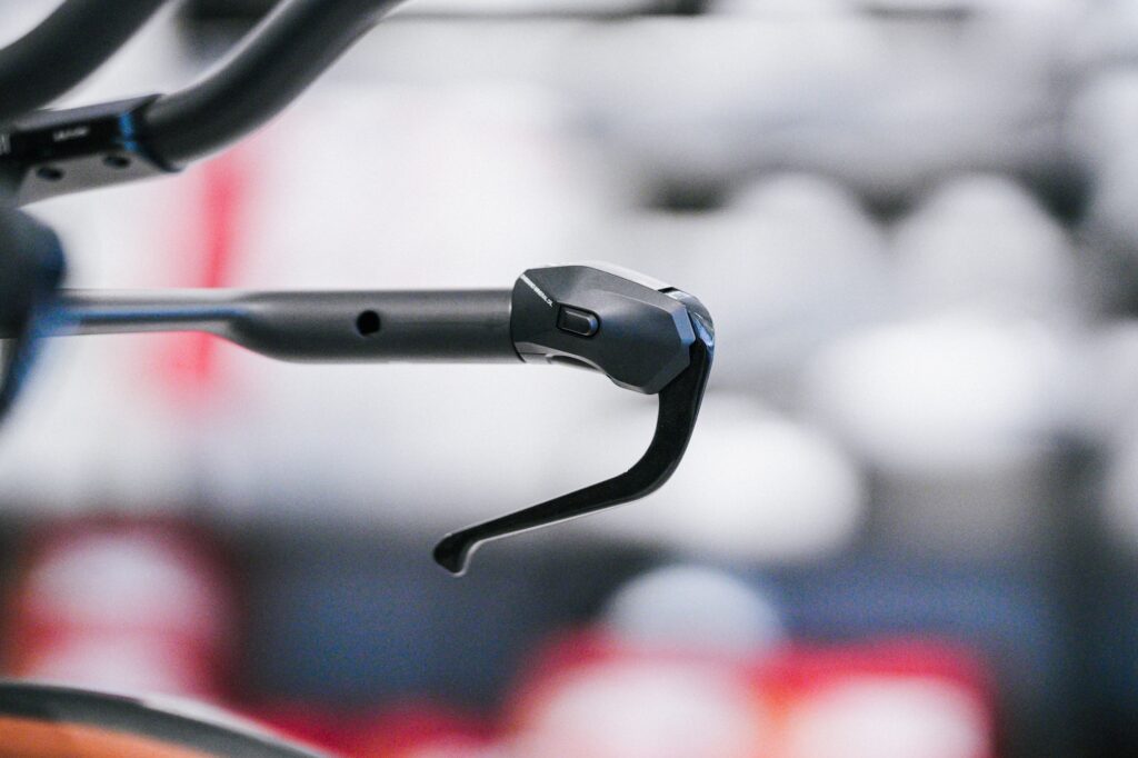 タイムトライアルバイク専用のシマノのシフトレバー&ブレーキレバー。エアロ性能を重視した設計です。