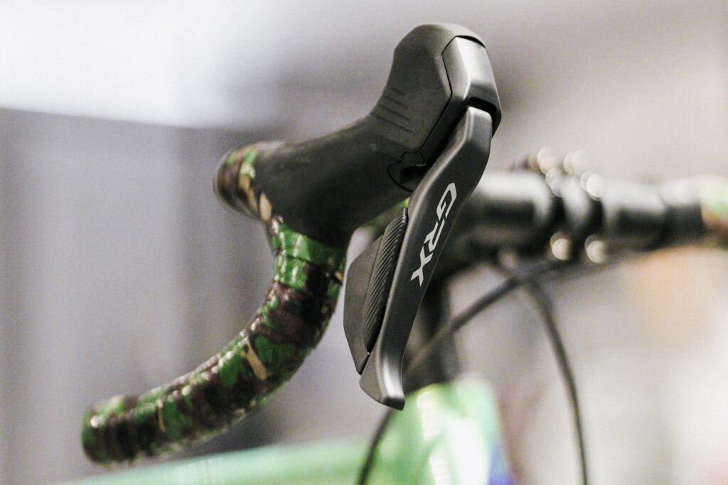 コンポーネントはシマノ GRX Di2。オフロードに向けた耐久性とブレーキ性能、優れたシフティングを併せ持った最上位グレードです。