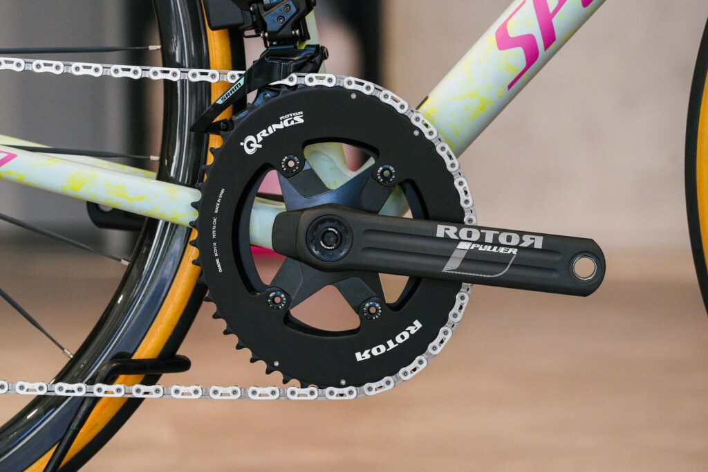クランクはROTOR INPOWER DMにQringsを組み合わせました。特にQringsは、クランクの動く速さとトルクの変動に合わせてギア半径を変化させることで、パワーを最大化しペダリングの効率を上げようというアイテムです。レースでもサイクリングでも大いに活躍すること間違いなしです。