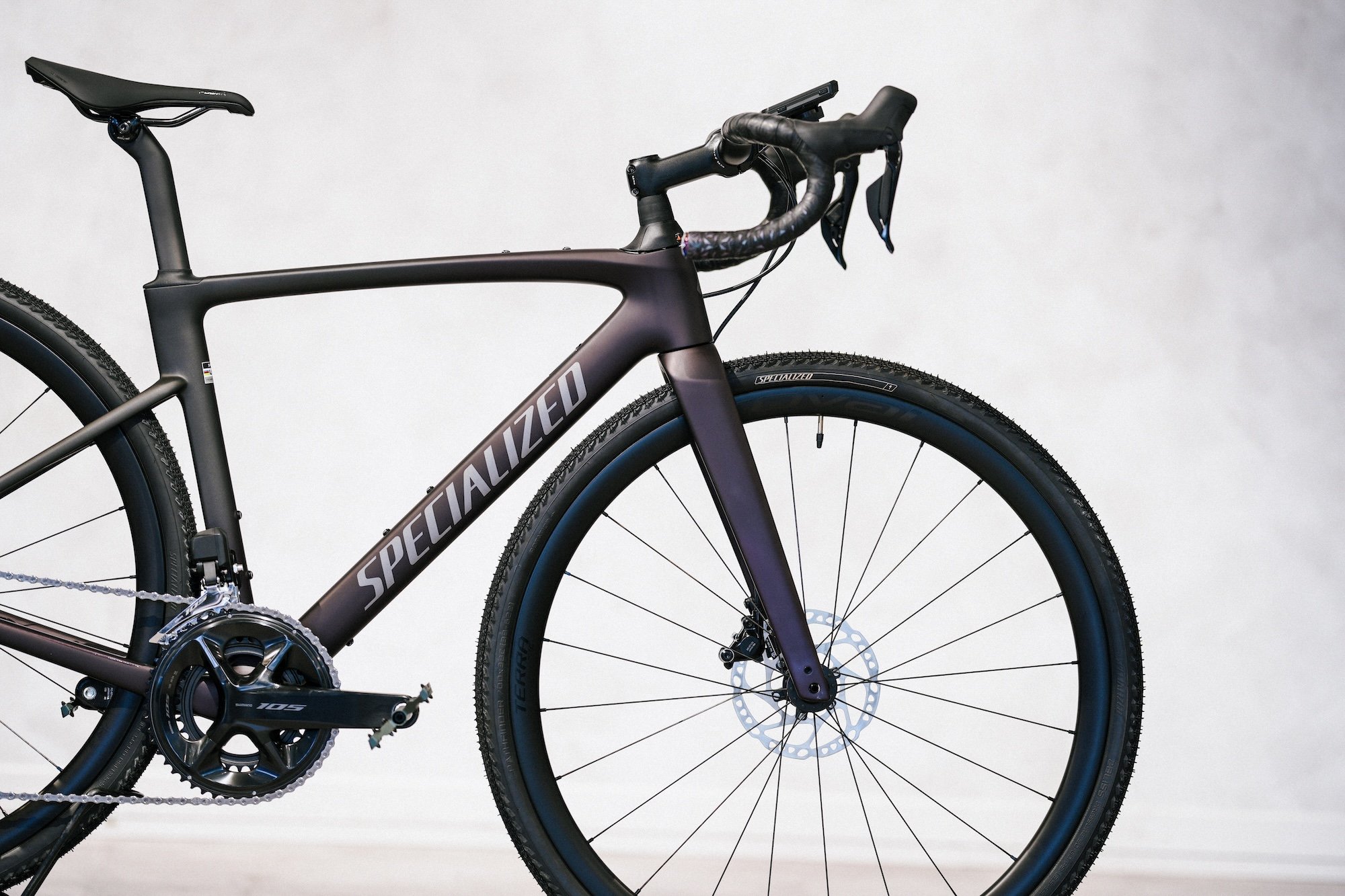 ホイールは純正のDT Swiss G540 アルミホイールから、ROVAL TERRA C WHEELSETに変更。ROVAL TERRA C は、カーボンリムを採用した、グラベルホイール。重量はホイールセット1,610gと200g以上の軽量化。リムはTerra CLXやCLと同じリムハイト33mmで内幅25mmの形状を採用し、昨今人気のワイドなグラベルタイヤをはじめとしたさまざまなタイヤを装着できます。