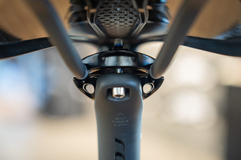 Aethosの強みでもある軽量化にも細部へこだわりが見られます。サドルのクランプ部分には肉抜きを施し、ブレーキキャリパーの台座部分にもその技術が見て取れます。その他にも、コラム内にあるプレッシャーアンカーボルトのコンパクト化など随所に軽量化への執念が現れております。