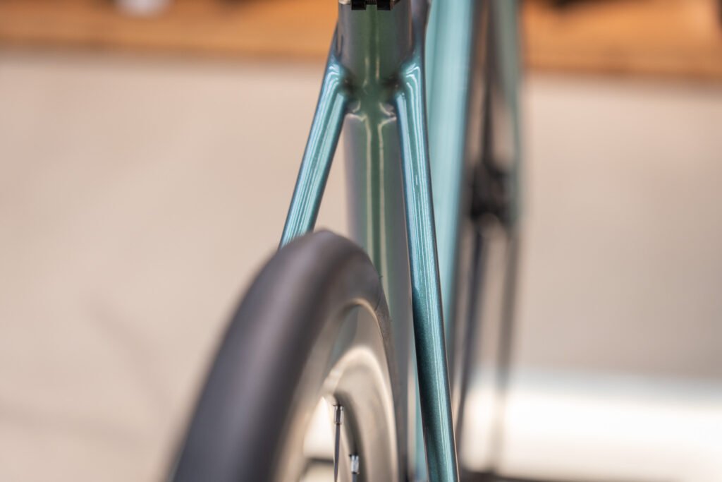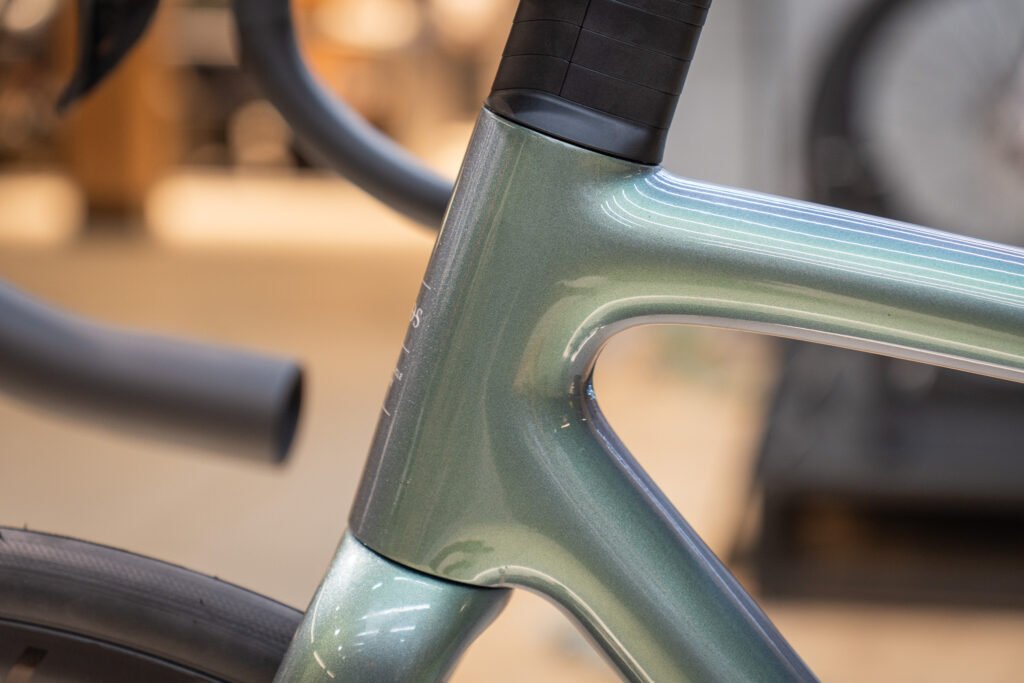 見た目では大きな変化のないように感じるAethos 2ですが、ジオメトリーは大きく変化しています。これまでジオメトリー自体はTarmac 同様レーシングバイクのものを採用しておりましたが、スタックを15mm高く設定し、0.5度ヘッドチューブを寝かせることでアップライトで快適な姿勢と、下りなどでの安定感を可能にしています。