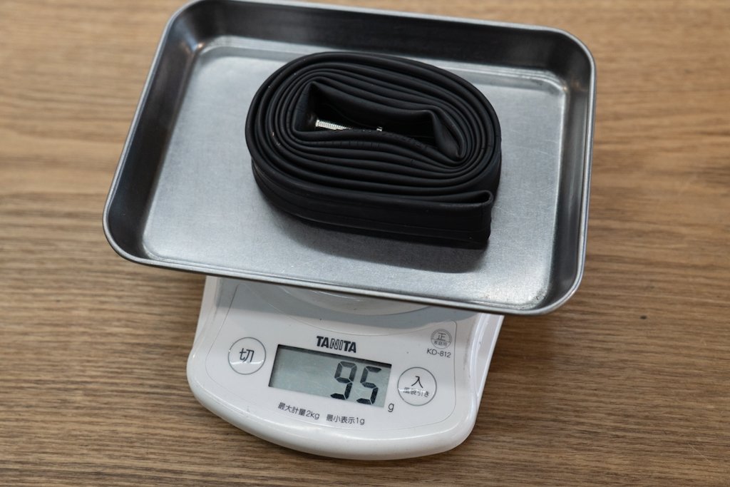 そして重量の実測ですが、ブチルチューブが95g(バルブ長48mm)に対し