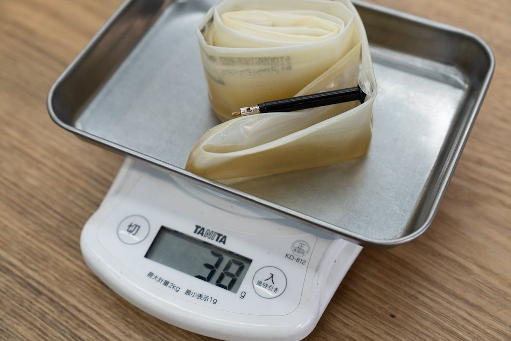TPU Tubeはなんと驚異の38g(バルブ長50mm)で、前後合わせると100g以上の軽量化。