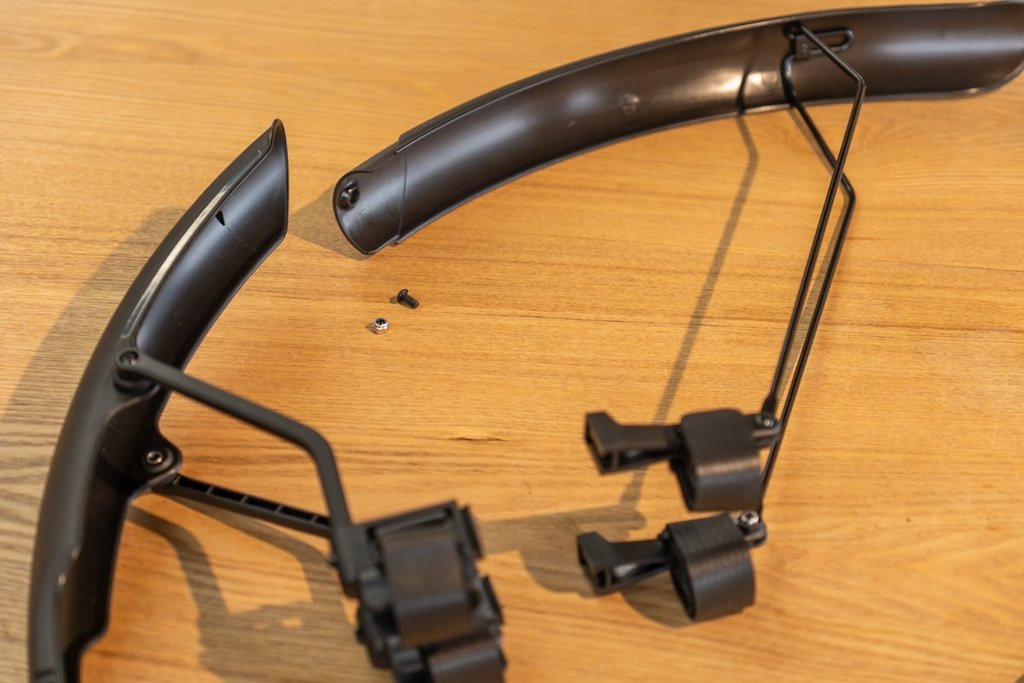 分割方法は簡単で、フェンダー上部の連結部を2.5mm六角で取り外し、シートステーの連結部のつまみを起こして上方向へ引っ張るだけ。