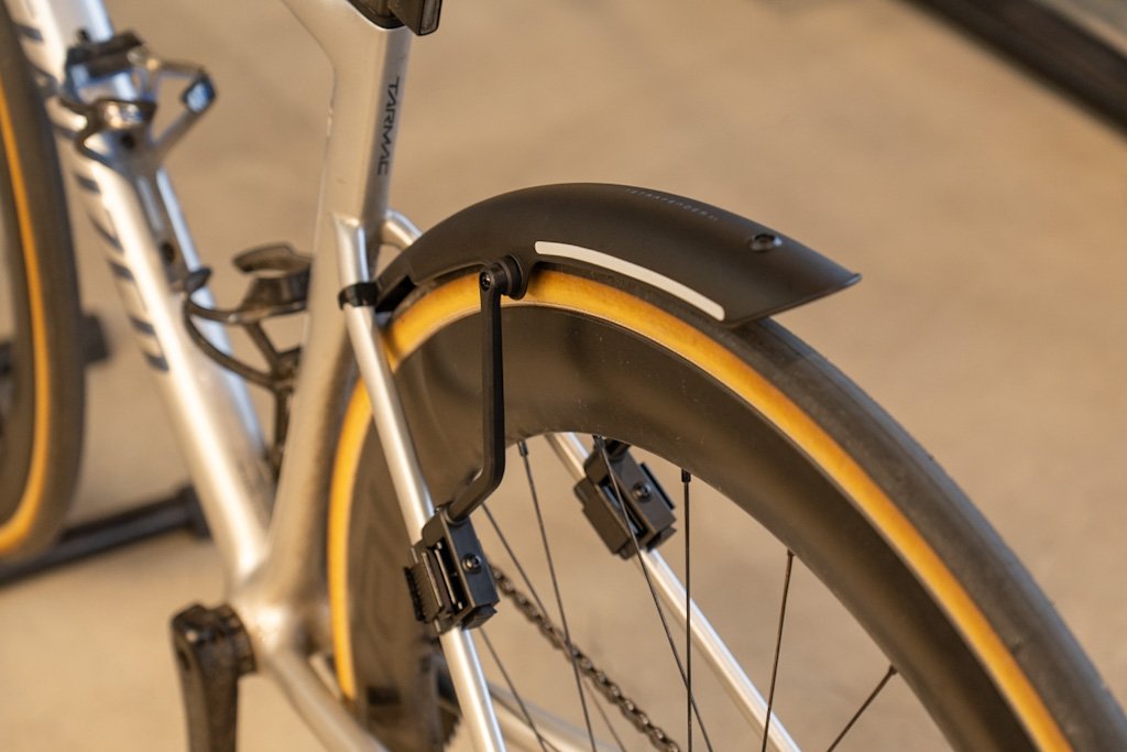 路面がドライでフェンダーはいらない、路面が少し濡れているが水・泥はねを心配するほどではないといった場合は容易くフェンダーの後ろ半分だけ取り外すことができます。