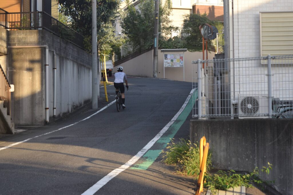 序盤から狭い住宅街を進み、すぐにカーブとともに急勾配が現れます。