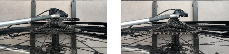 これでリアディレイラーの張り出しが最小限になり、隣の自転車や壁に接触した際のハンガーやディレイラーへのダメージを軽減できます。