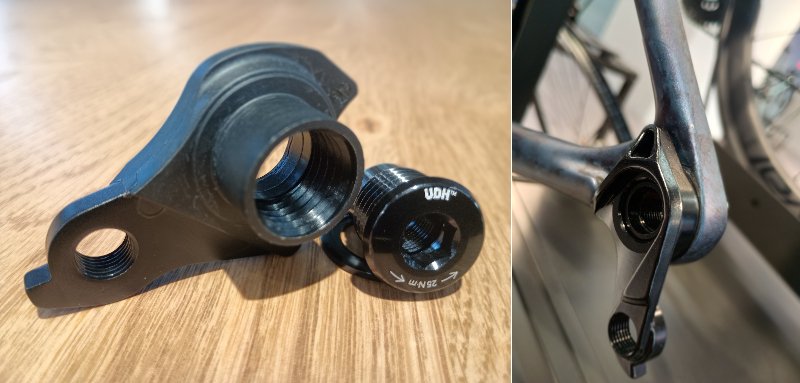 最近のモデルでは、Universal Derailleur Hanger(UDH)規格を採用するフレームが増えています。