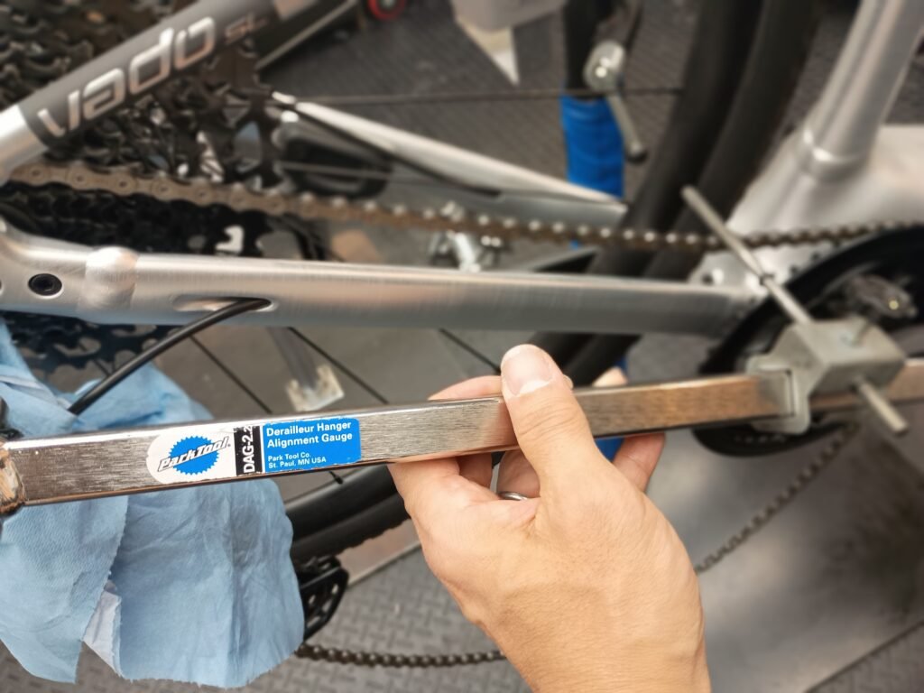 ディレイラーにキズがあればもちろん要注意ですが、見た目がきれいでもハンガーが内側へわずかに曲がっていることがあります。