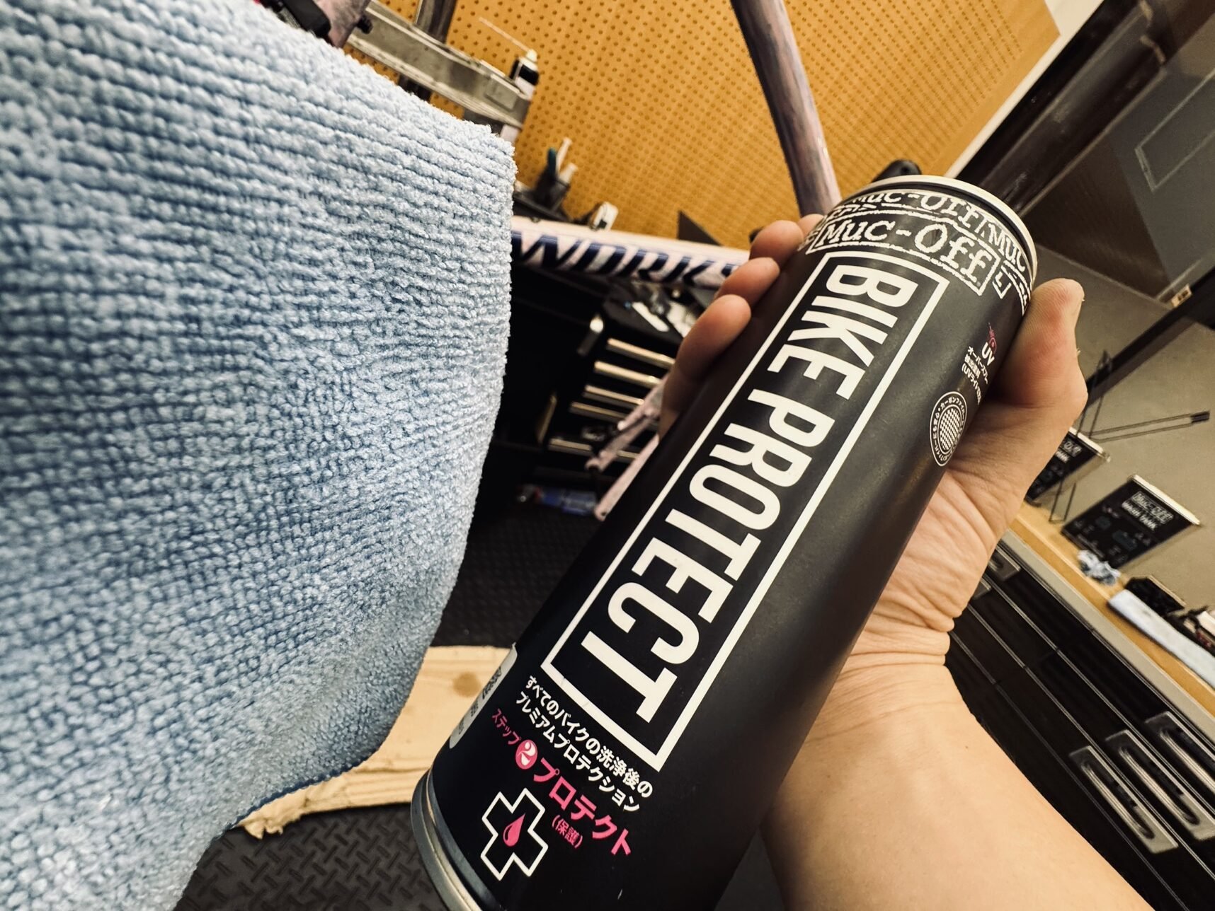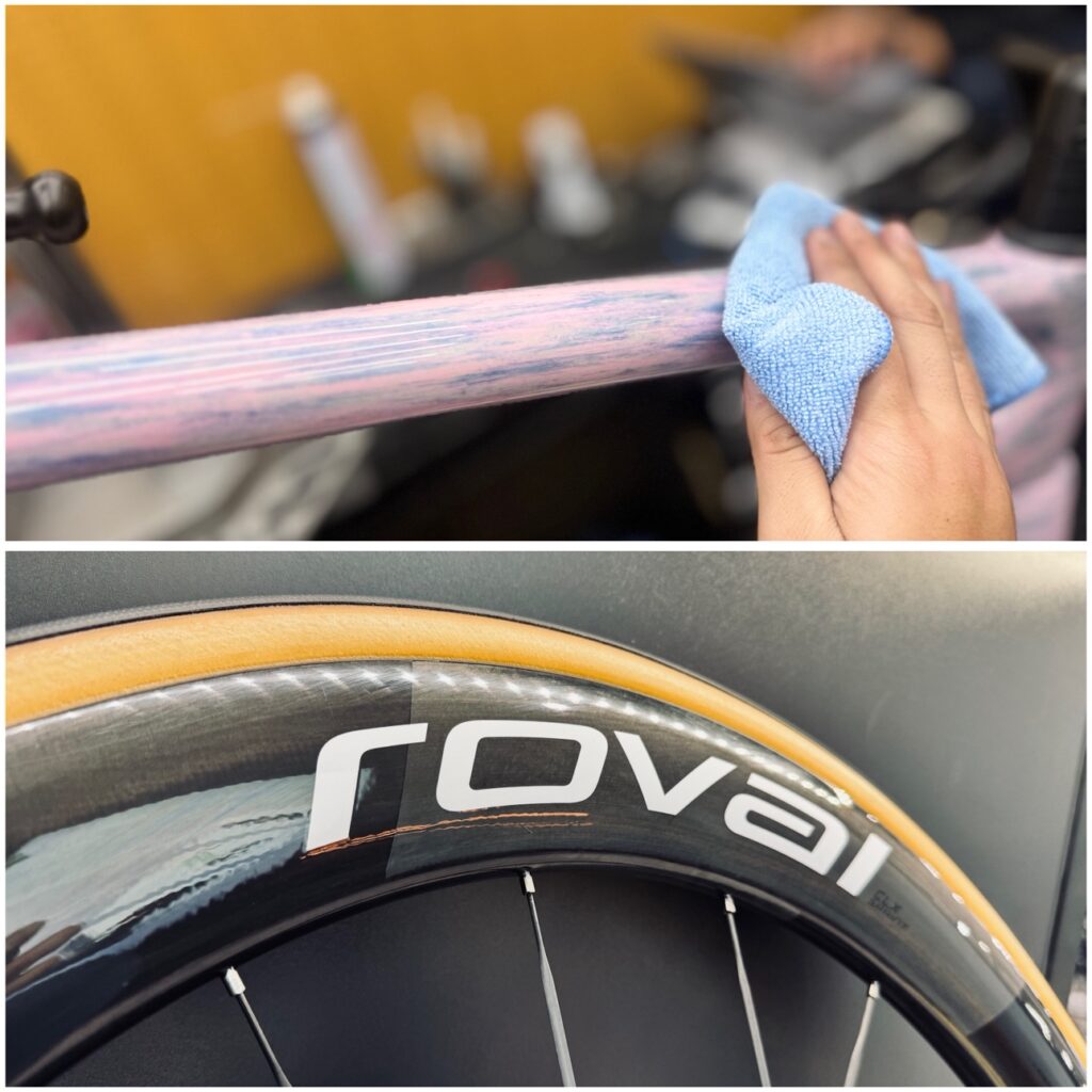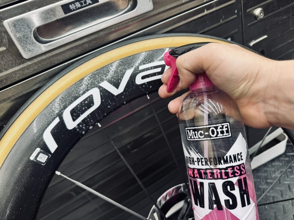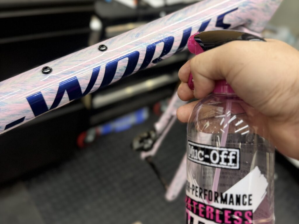 チェーン洗浄を行った後はフレームに室内洗車に使える「WATERLESS WASH」を使います。