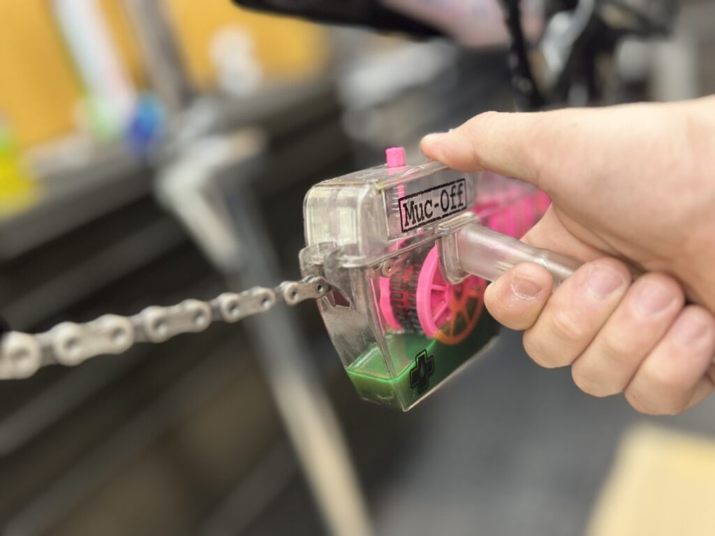 まずはチェーンから、「MUC-OFF」のX-3 DIRTY CHAIN MACHINEを装着して、クランクを回転させて洗浄を行います。洗浄後はディグリーザーを洗い落とし、乾いた布で水分を拭きとります。