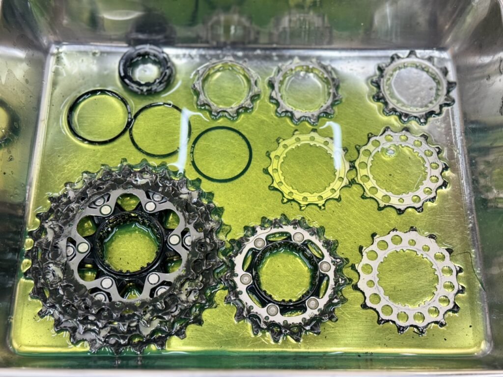 フレームやホイール、チェーンの洗浄を行っている間にカセットスプロケットをディグリーザーに漬けておきます。