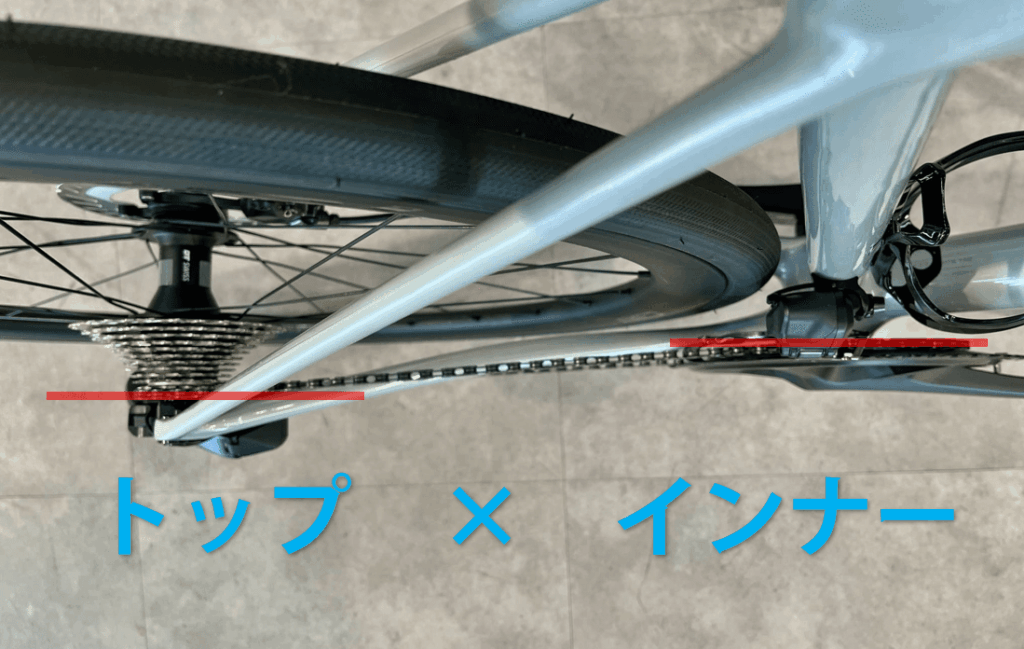 フロントは「インナー(小さいギア)」、リアは「トップ(小さいギア)」へ。