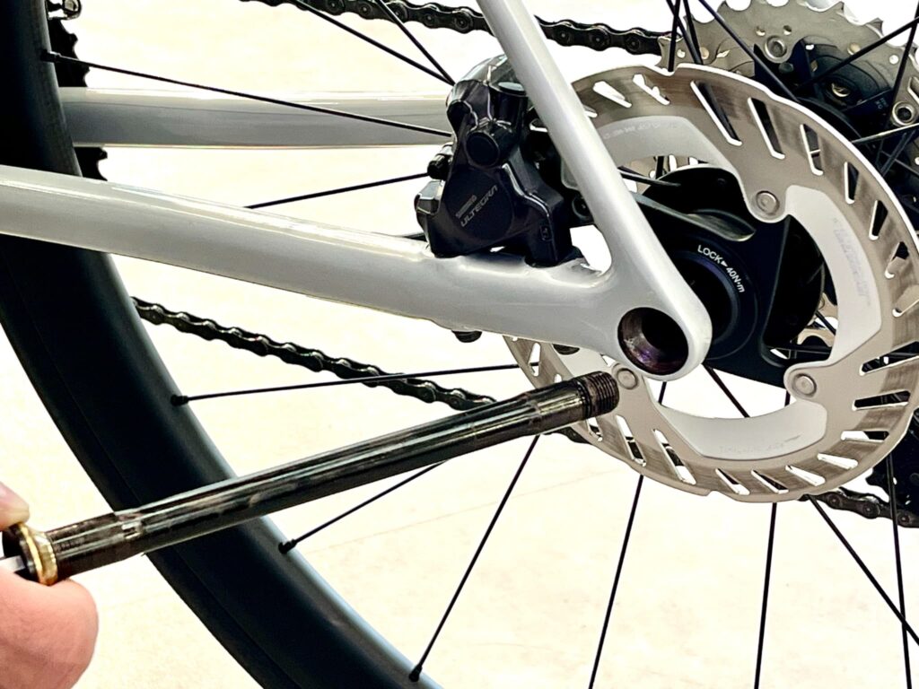 レバー式はそのまま、六角レンチ式はそのメーカーに合ったサイズのレンチを装着し、リアのスルーアクスルを反時計回りで緩める。