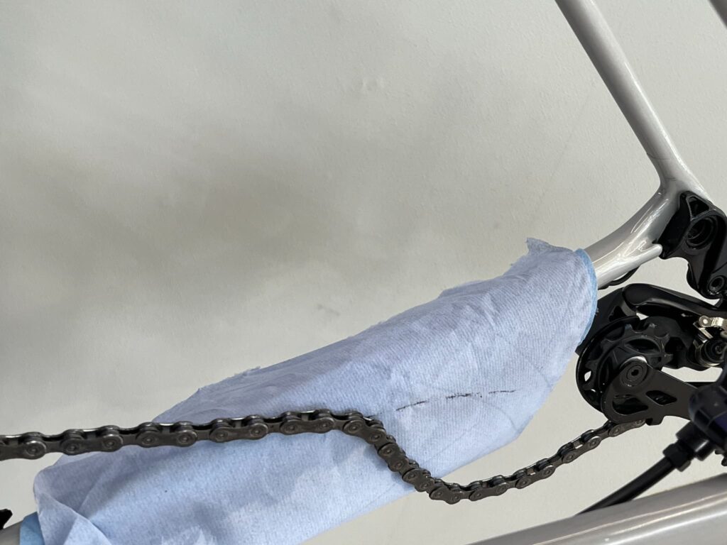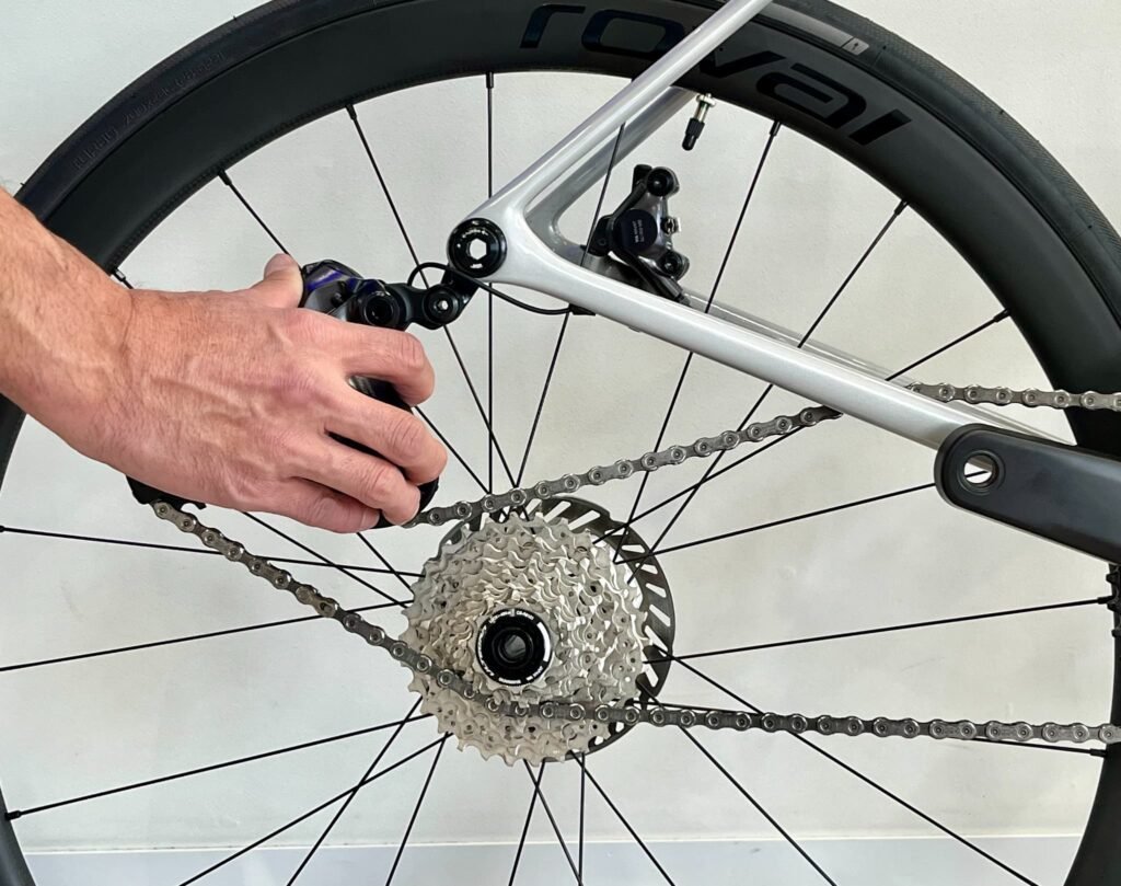 タイヤが地面に当たった状態でフレームを上方向に持ち上げると、スプロケットがスムーズにチェーンとRDの間を抜けていく。