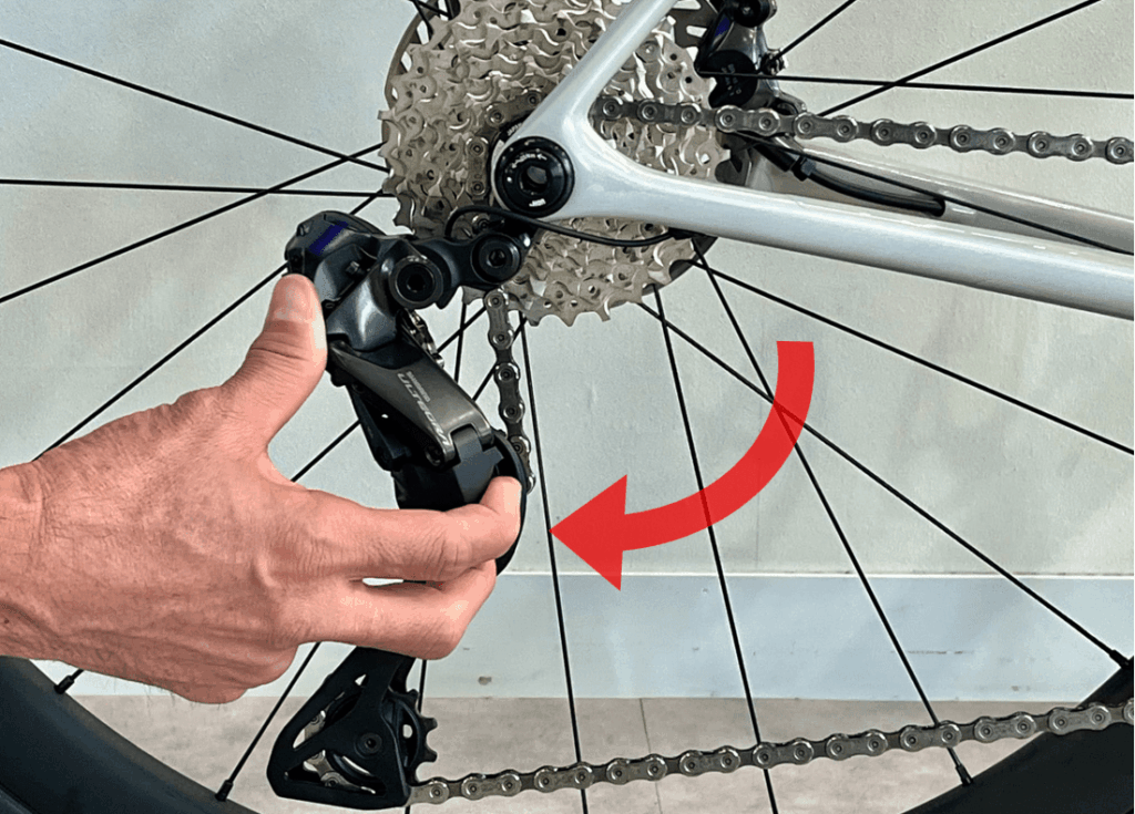 RDを後方に倒すことでチェーンのテンションを逃がし、ホイールが下に抜けるための通路ができる。