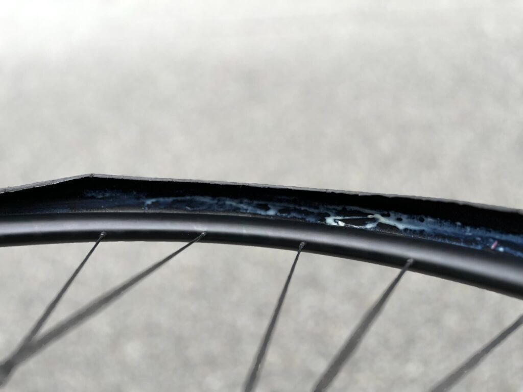 ある日いつものようにライドに出かけて、ちょっとした段差で「プシューッ」とエアが抜けたんです。「まぁシーラントが塞いでくれるだろう」と思っていたら…まったく反応なし。「なんでやねん!何のためのシーラントやねん!」と、ブツブツいいながらタイヤを外すと、中はカラッカラでシーラントはほとんど干上がっていましたw