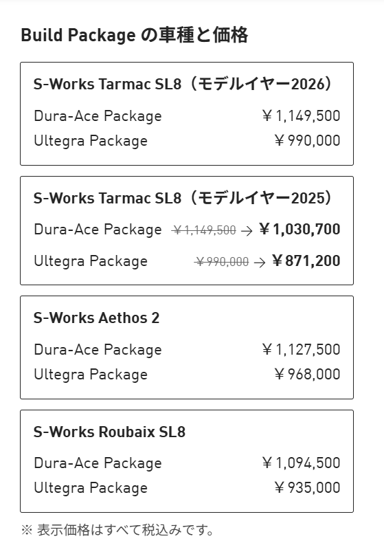 こちらはS-Works Tarmac SL8だけではなく、S-Works Aethos 2やS-Works Roubaix SL8も対象のキャンペーンです。シマノ製グループセット(Dura-Ace or Ultegra)を組み合わせた、特別価格のパッケージをご用意しています。