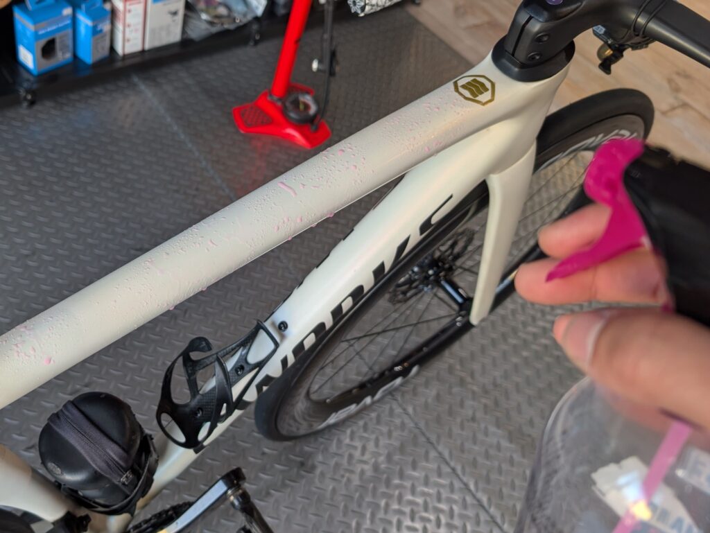 使用感としては伸びが良くてコーティングがしやすいので非常に簡単です。コーティング後は艶がでますので、マットなフレームカラーの場合はしっとりとした質感になり少し艶が出ます。元々艶があるフレームには気にせずお使いできると思います。