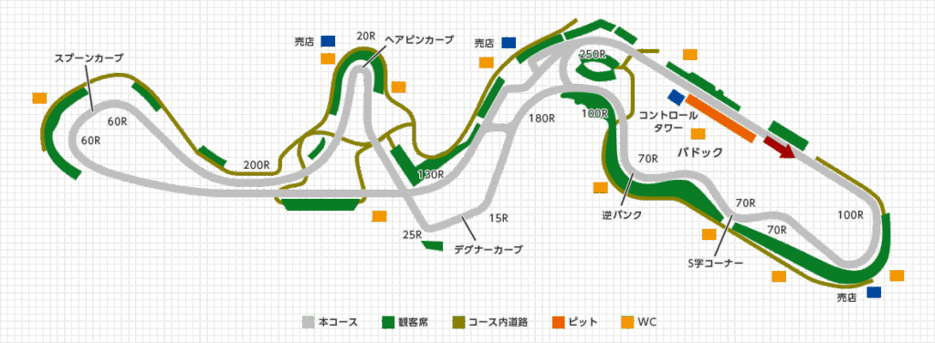 鈴鹿サーキットのコースは左回りで走行するためホームストレートは緩やかな登りがしばらく続くようなコースで後半は下りやヘアピン、S字カーブなどがあるため非常に速度が上がるコースとなります。