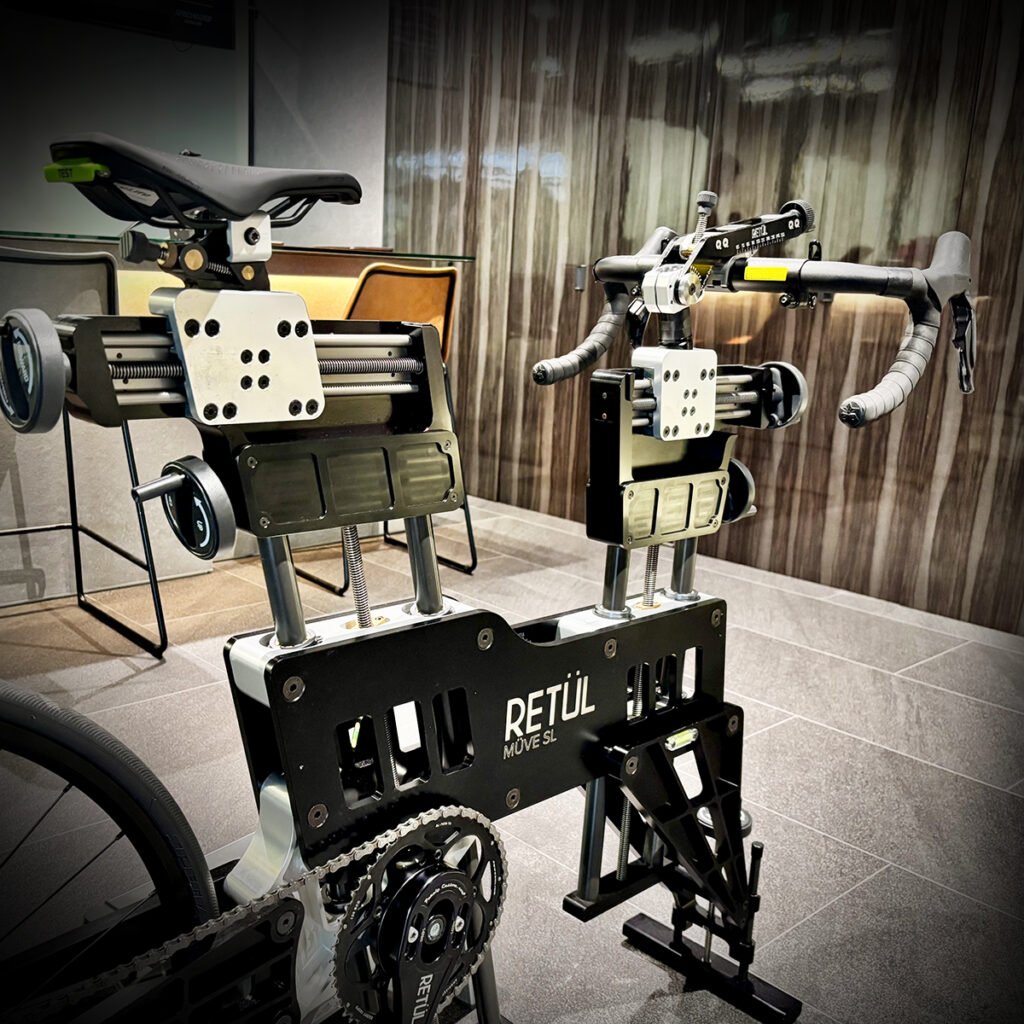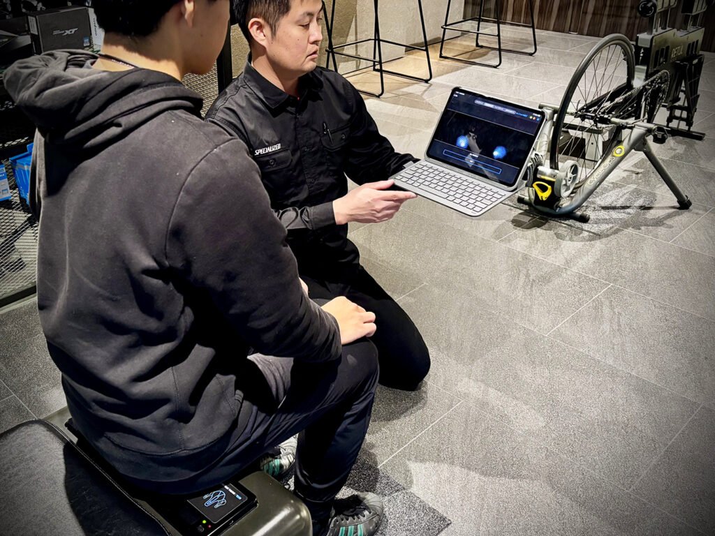 店頭にはテストサドルもございます。店内のスケールバイクに取り付けて、実際にペダリングした際のフィーリングを丁寧にお確かめいただけます。