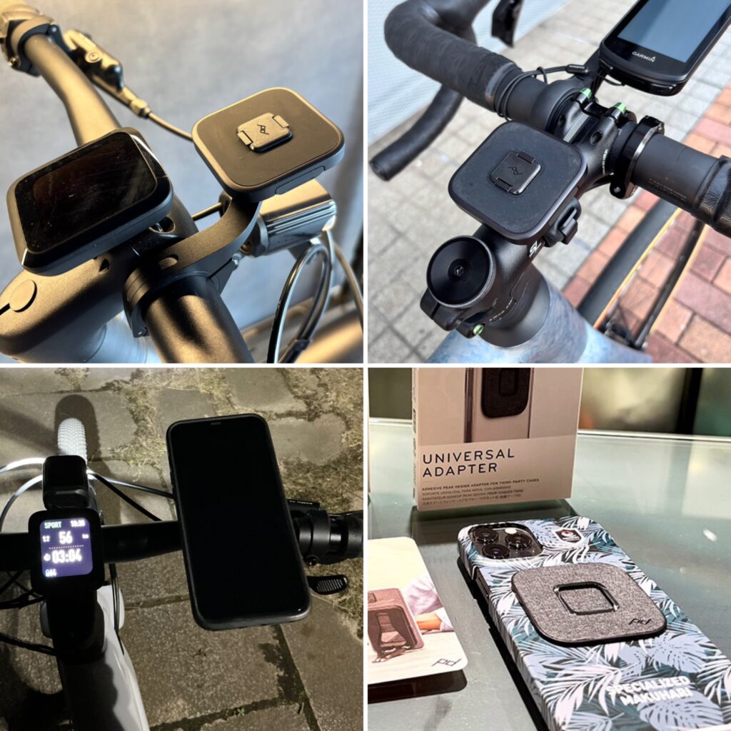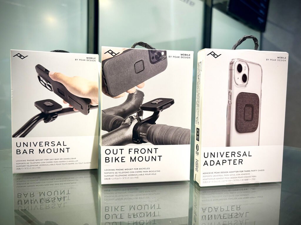 バイクから降りた後も、そのまま普段使いできる洗練されたデザインが魅力。専用ケースだけでなく、お気に入りのケースに貼り付けられる「ユニバーサルアダプター」も入荷しています。