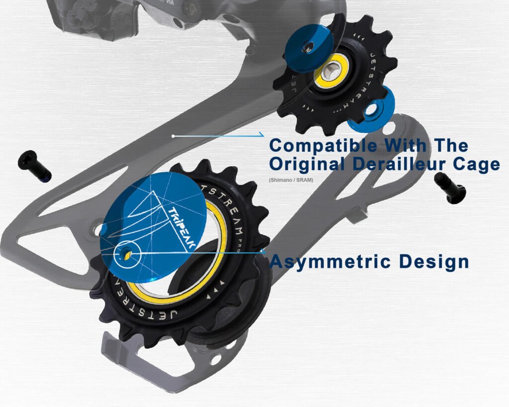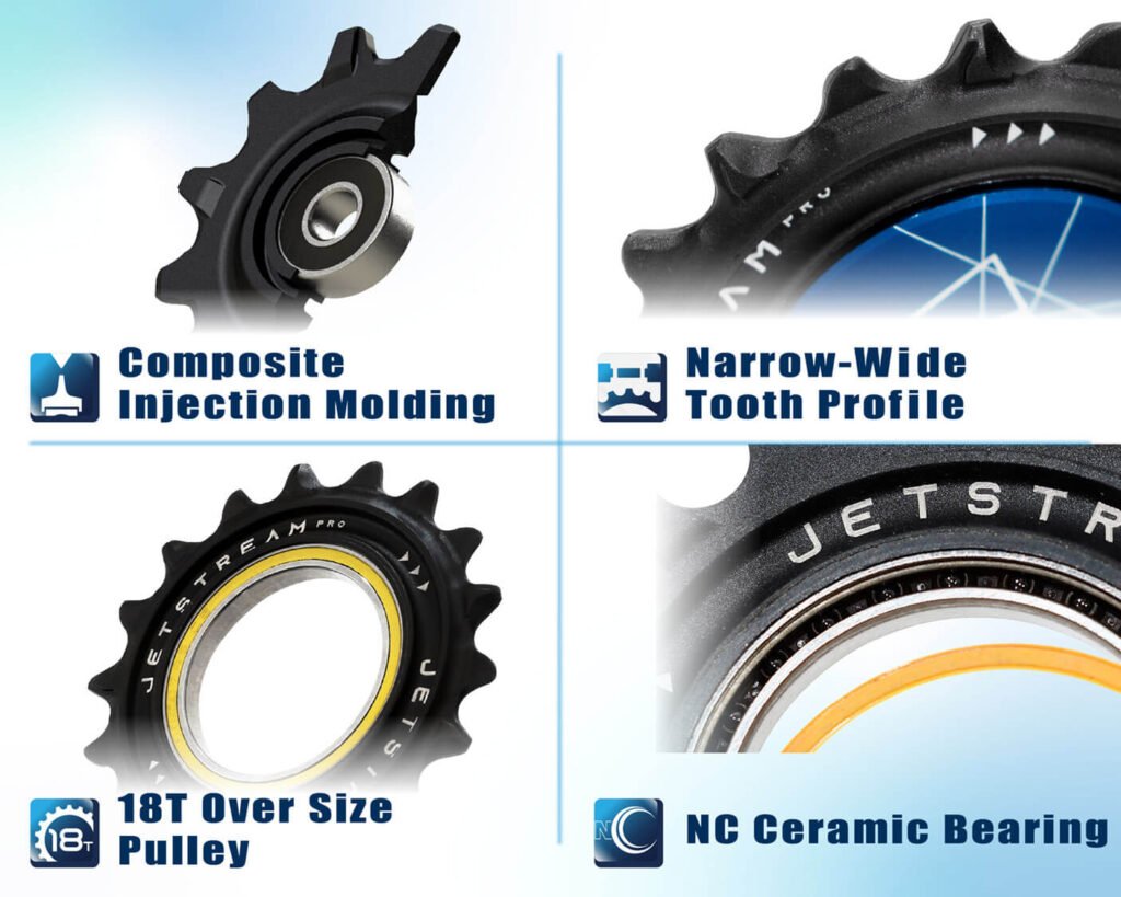 プーリー径は18Tのオーバーサイズを採用。チェーンの曲がりを緩やかにすることで抵抗を最小限に抑えます。さらに、心臓部には高精度なCNCセラミックベアリングを搭載。指で回しただけで違いがわかる「滑らかさ」はTRiPEAKならではの品質です。