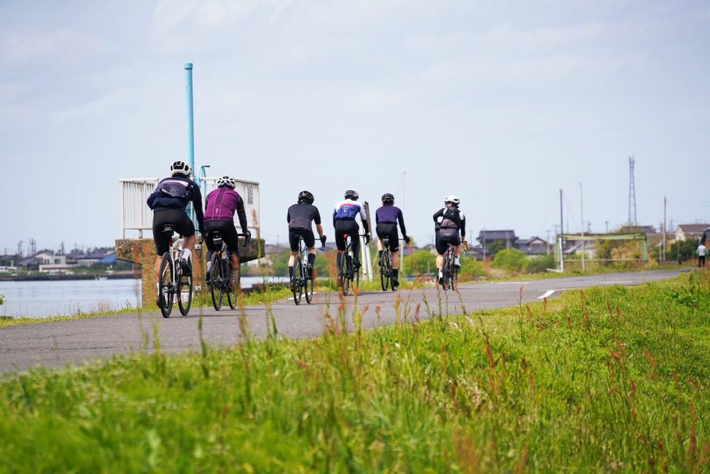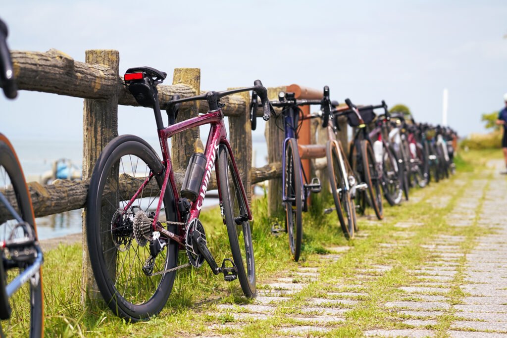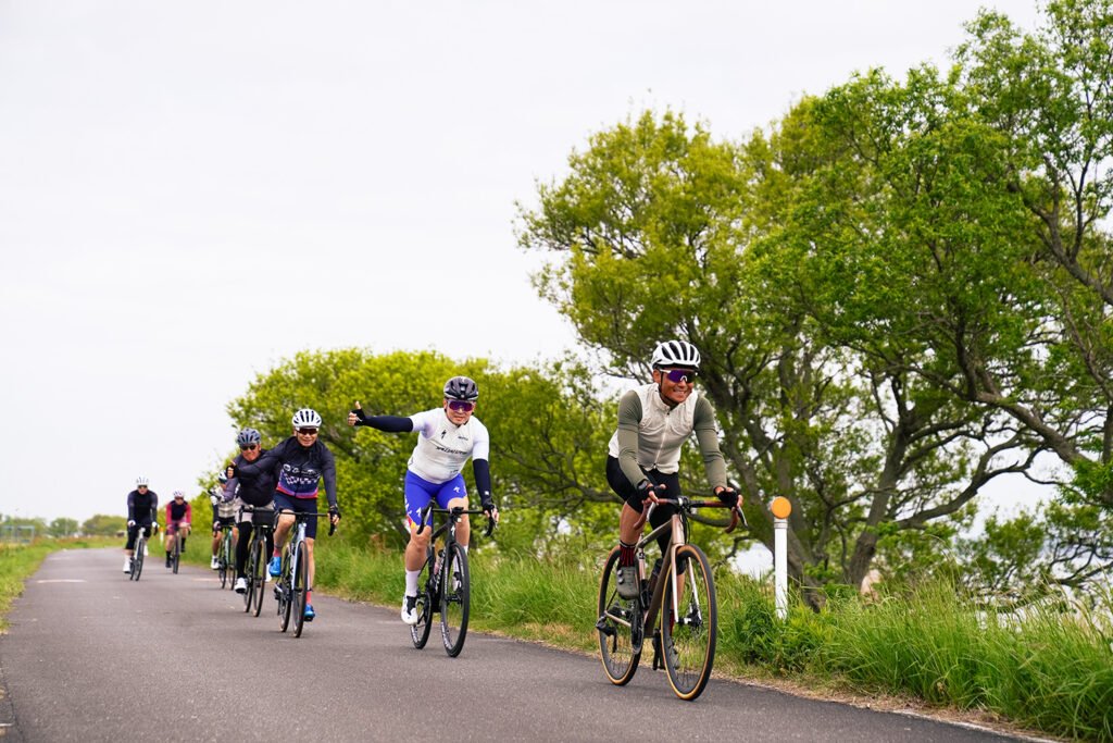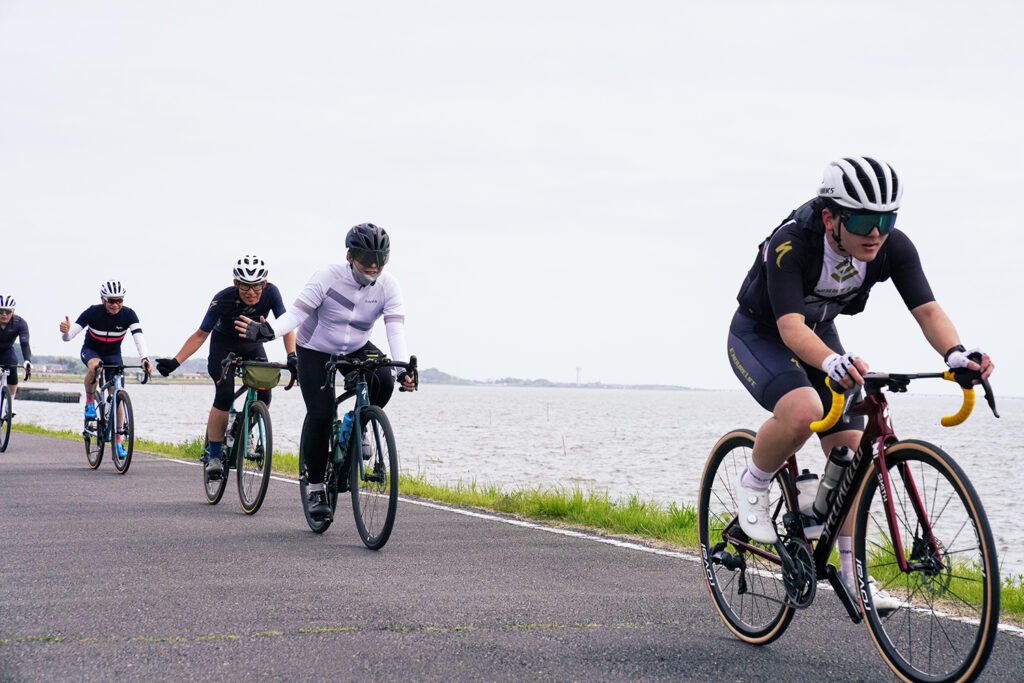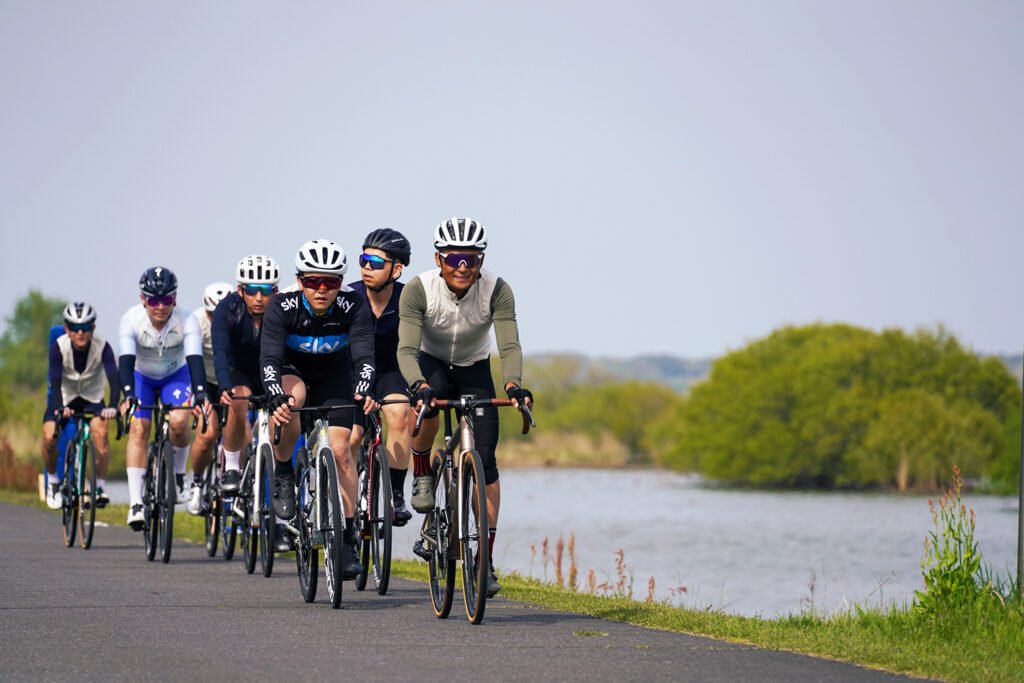 湖畔の平坦で走りやすいルートを、参加者全員の足並みを揃えて心地よいペースで進みます。「無理をせず、安心・安全に」がS-Clubのモットー。一人で走るストイックなライドも良いですが、仲間と励まし合いながら全員が無事にフィニッシュした時の満足感は、何物にも代えがたいものです。