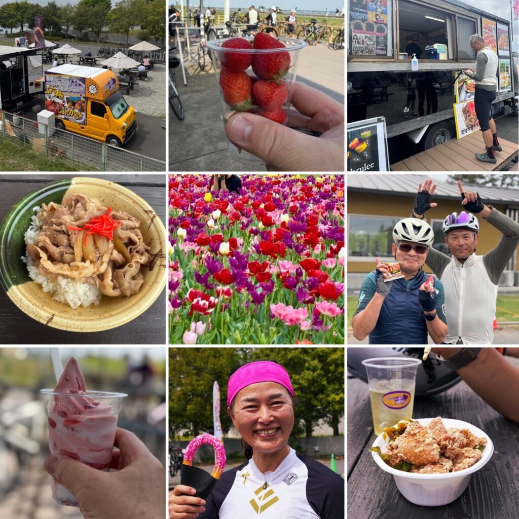 今回のルートは、ただ走るだけでなく、視覚も味覚も満たされるものでした。 見渡す限りの広大な湖。そしてキッチンカーで頂いたボリューム満点のから揚げやスイーツ。参加者の皆様の笑顔が、このライドの成功を物語っていました。