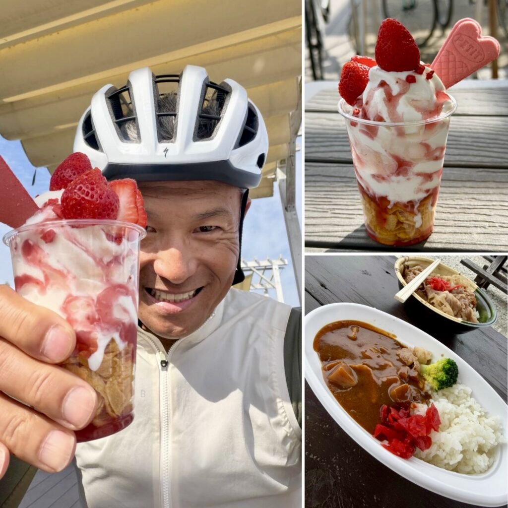 ライドの醍醐味である「グルメ」もしっかり堪能! お昼は常陸牛カレーでエネルギーをチャージし、ご褒美には旬のストロベリーパフェ。休憩をたっぷり取りながら、全員が笑顔のままカスイチをコンプリートしました。