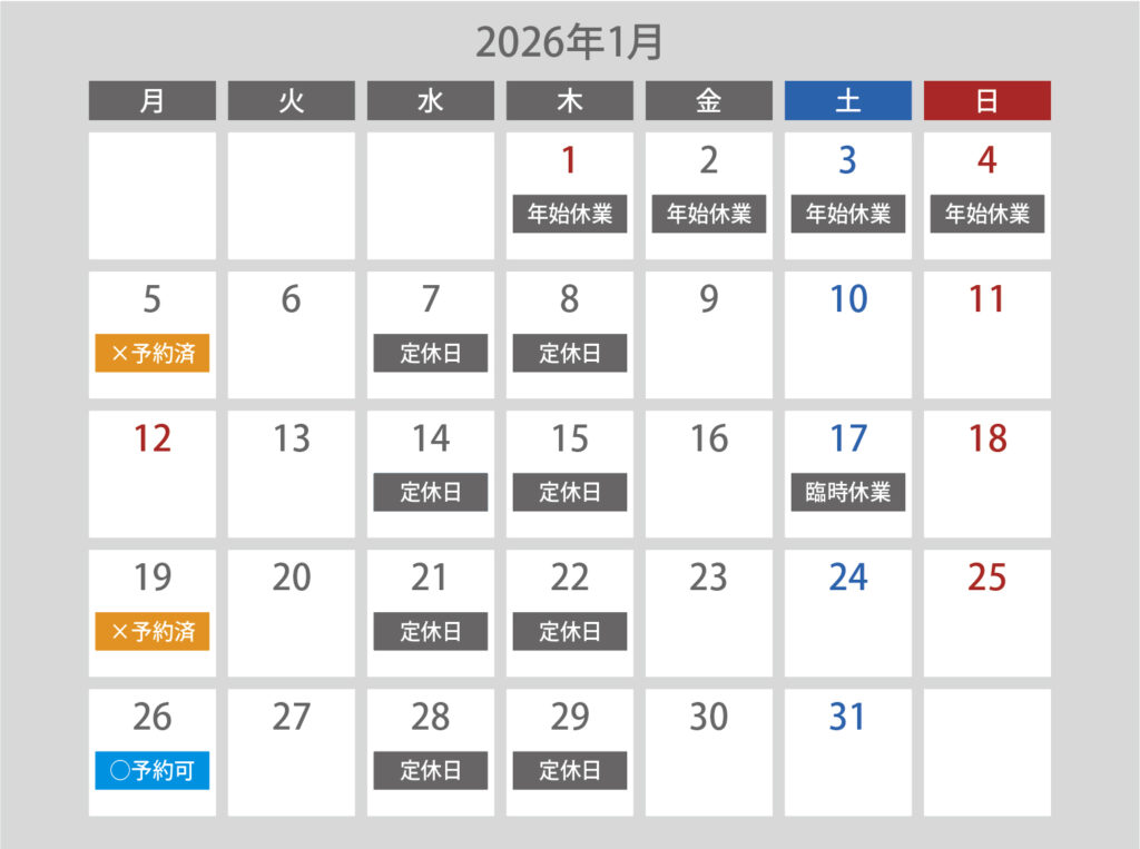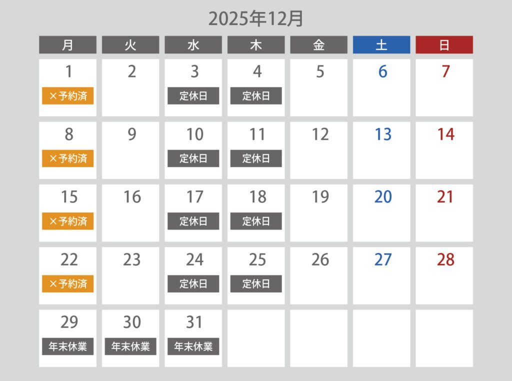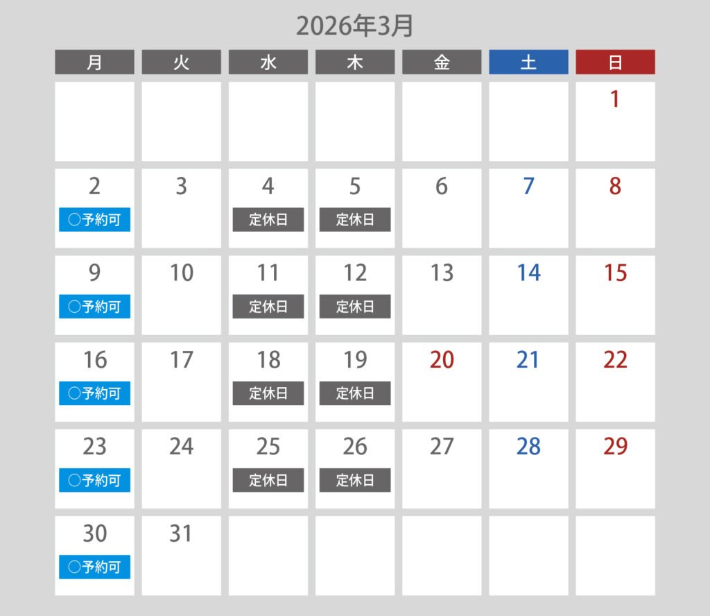 下記カレンダーの[○予約可]より希望日をお選びいただき、予約フォームからお申し込みください。
