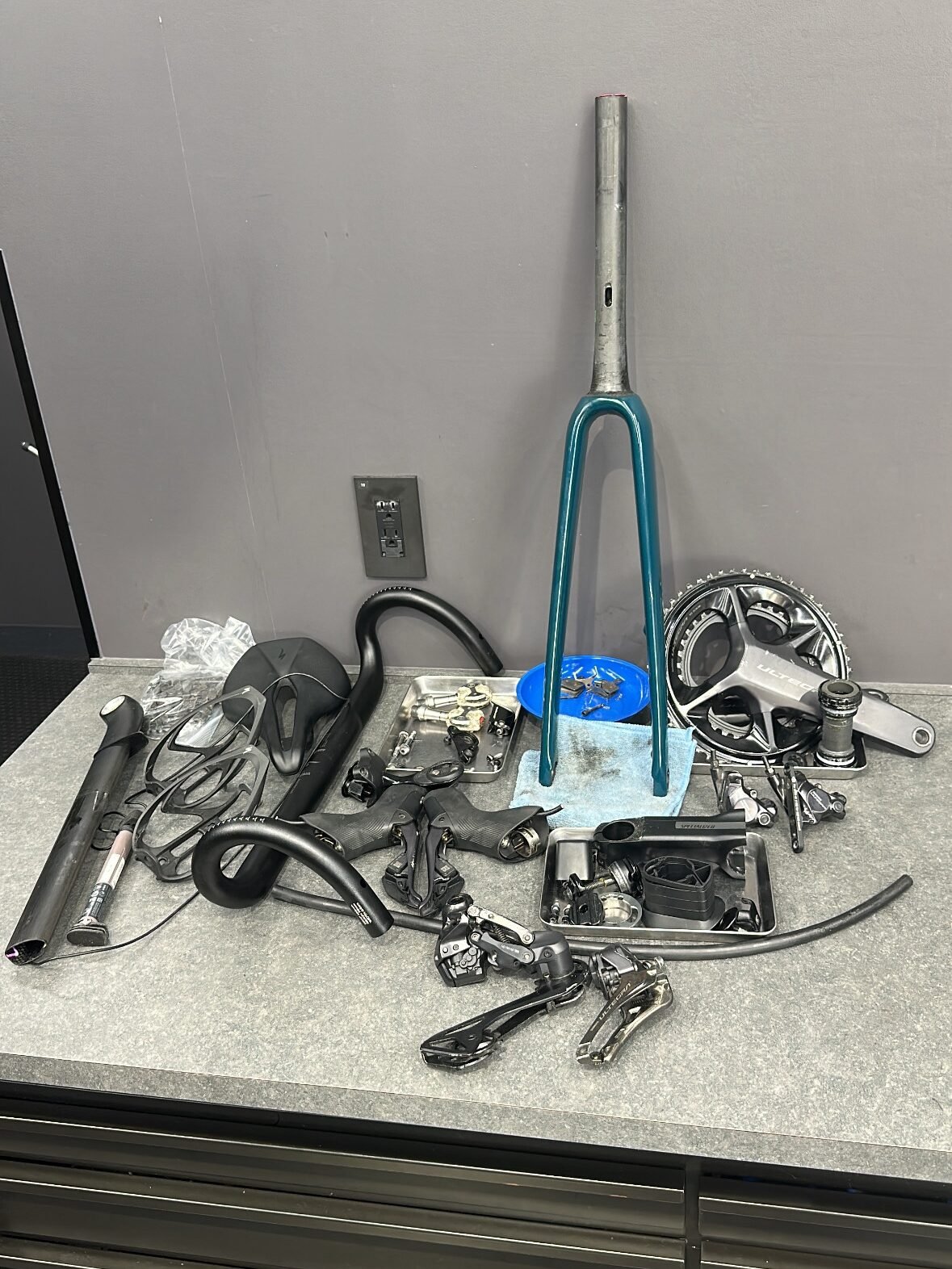 分解とパーツ選定が全て済むと次は、フレームセット・ホイール・パーツ1つ1つ洗浄していきます。