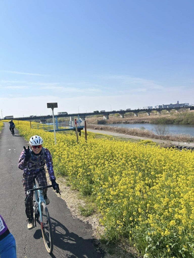 菜の花が広がり始めて、咲き始めの薄い黄色の真ん中をサイクリングルードが