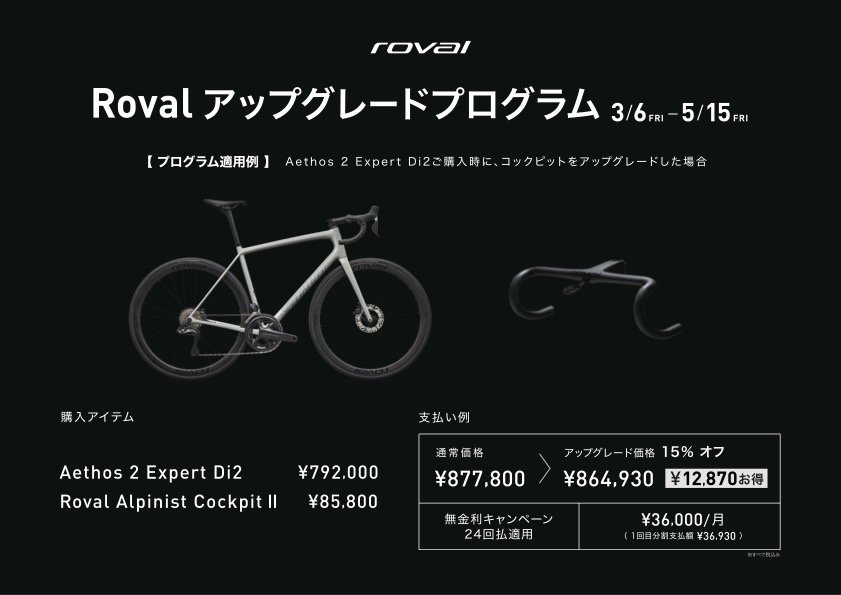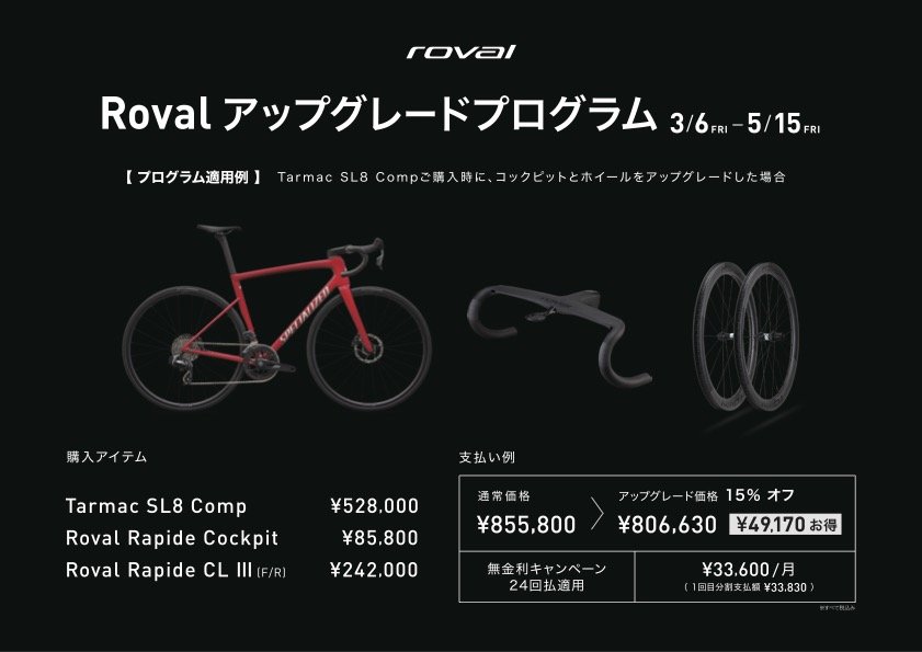 スペシャライズドでは、3月6日(金)~5月15日(金)まで、Roval アップグレードプログラム実施中です。スペシャライズドの新車購入時に適用でき、Roval のホイールとコックピットを15%オフの特別価格で手に入れられます。もっと速く、軽く、スタイリッシュな走りを求めるライダーに最適。無金利キャンペーンとの併用も可能です。Roval が誇る軽さ・安全性・空力性能は、あなたのライドを確実に変えてくれるでしょう。最高のセットアップで、新しい季節を走り出しましょう。