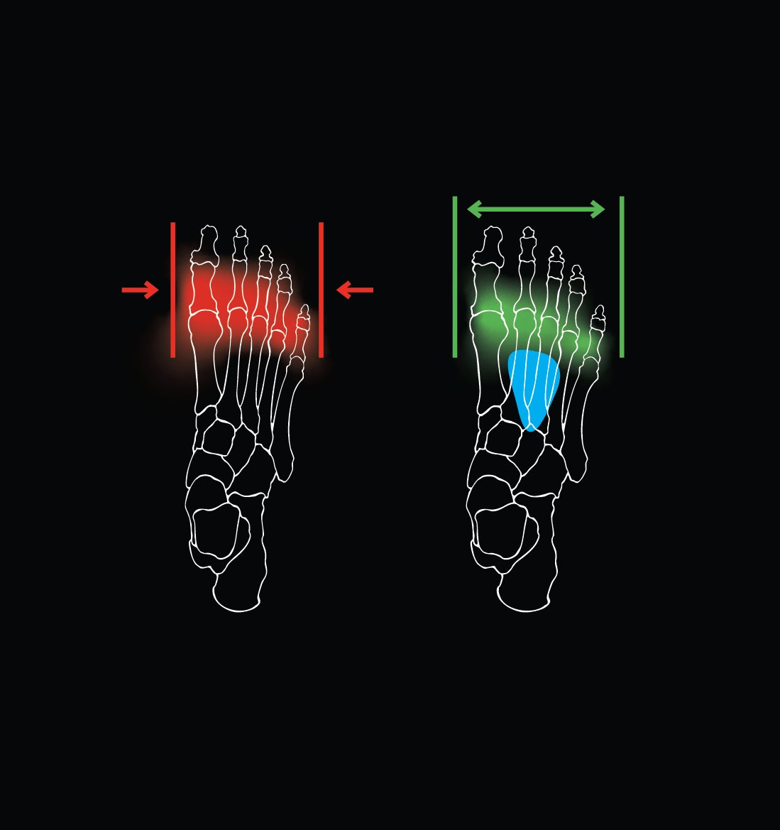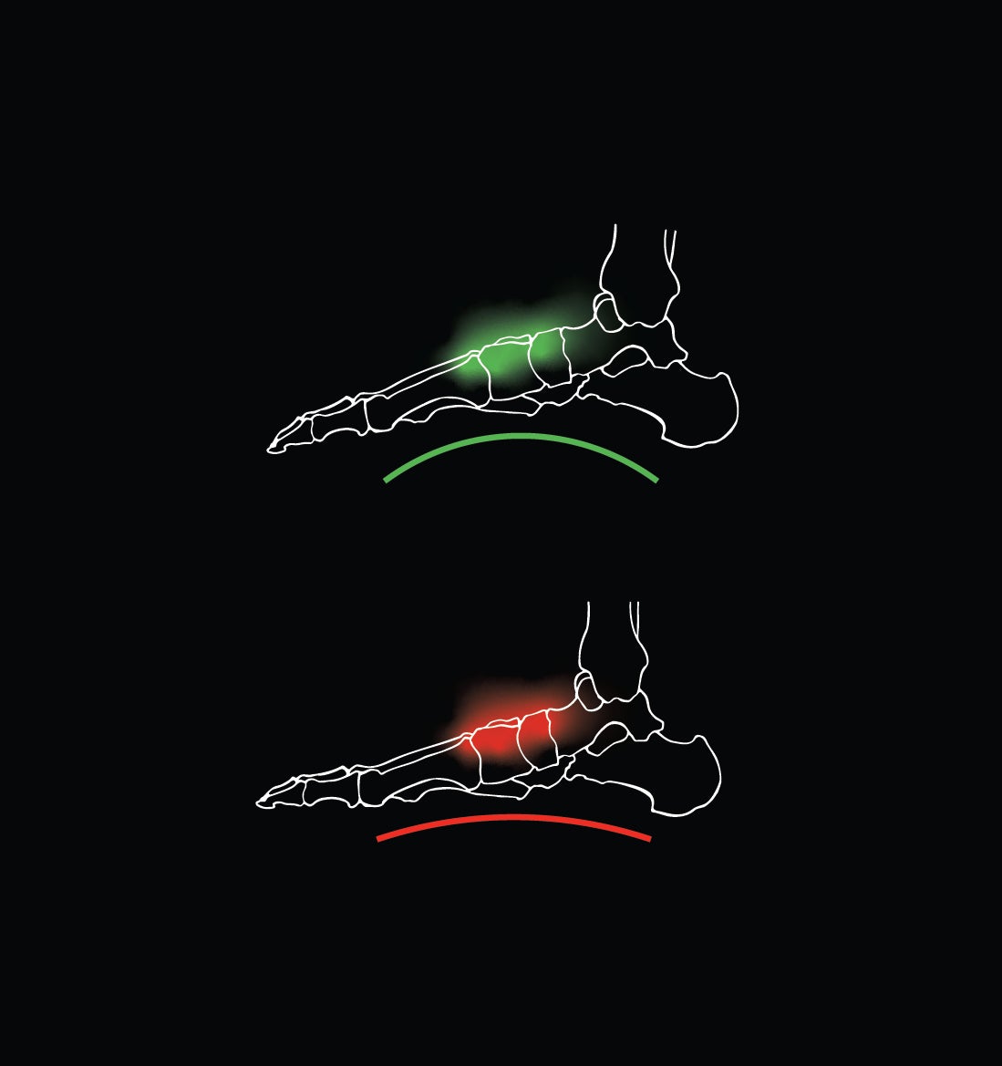 インソールに組み込まれた中足骨ボタンは、前足部の骨を持ち上げて分離することで、神経や動脈の圧迫を防止