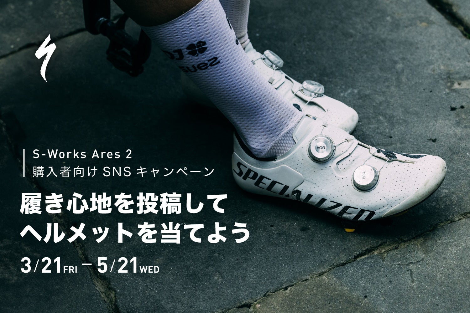 S-Works Ares 2のご購入者様を対象に、プレゼントが当たるSNSキャンペーンを開催します。S−Works Ares 2を実際のレースやライドで使用した履き心地、お気に入りポイントなどを、Instagramに投稿ください。その際、スペシャライズド・ジャパンをメンションの上、指定のハッシュタグを添えていただくと、キャンペーンの応募となります。応募者の中から抽選で1ヶ月ごと2名様にS-Works Evade 3が当たります。