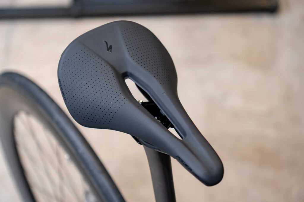 サドルはPower Arc Expertに変更。ペダリングを妨げないよう、弧を描くような形状となっているショートノーズタイプです。